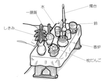 その他には、水・枕団子・一膳飯・花台(樒・一輪菊)を飾ります。 一膳飯は故人が使っていた茶碗に御飯を丸く山盛りにし、箸一膳を真 っ直ぐに突き立てます。(宗旨によって多少異なります)
